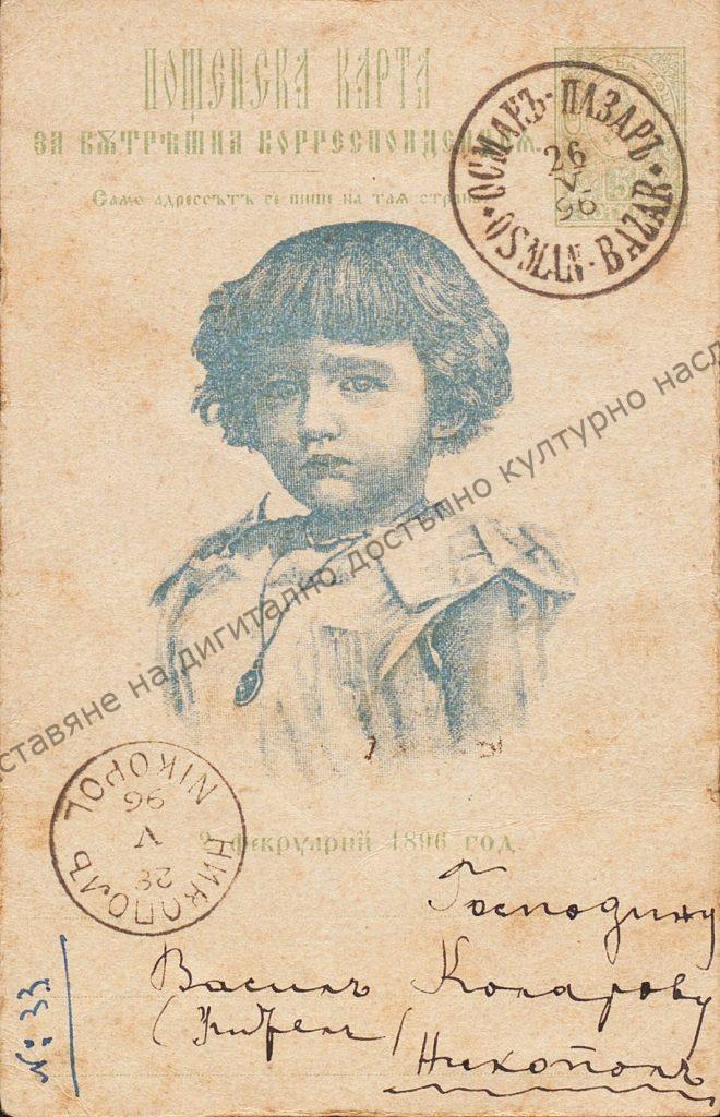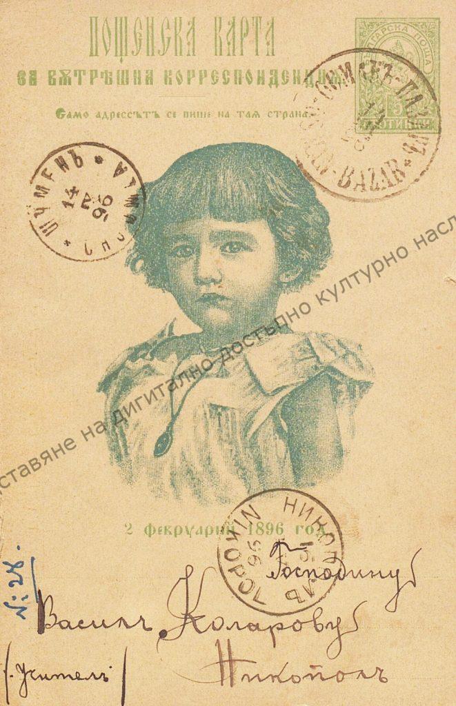 Пощенска картичка до В. Коларов учител в Никопол от Йордан Г. от Разград, 1896 г. На лицевата страна на картичката е нарисувано в синьо малко момиченце. Размер 13/8,5.