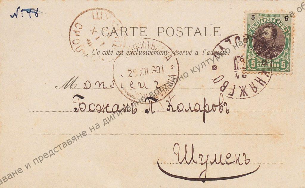 Пощенска картичка до Божан Коларов от брат му В. Коларов, Княжево 1901 г. На лицевата страна цветна рисунка на девойка, под нея стихове на френски език. Размер 13,5/8.