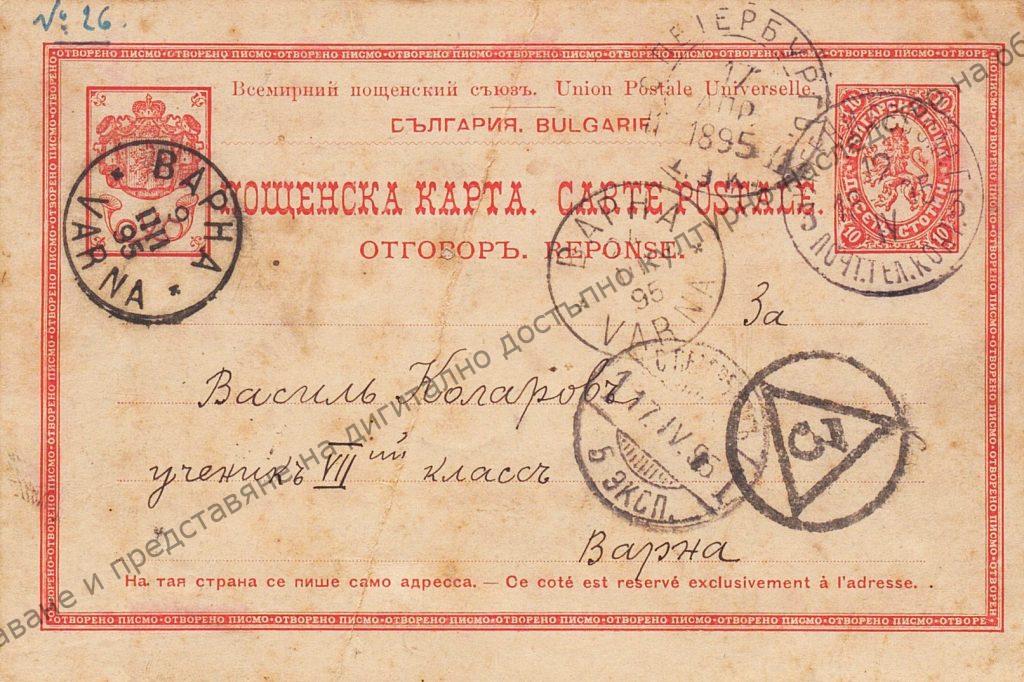 Пощенска картичка до В. Петров Коларов – ученик в VII клас в гр. Варна от Петербург 1895 г. Съобщава му се, че може да си набави 144 тома избрани произведения на руски писатели за 48 рубли. Размер 8,5/13,5.