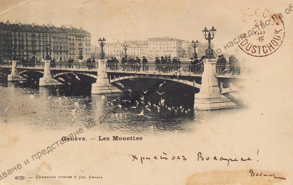 Пощенска картичка до Петър Д. Коларов от сина му В. Коларов, Женева 1899 г. Размер 8,5/13,5.