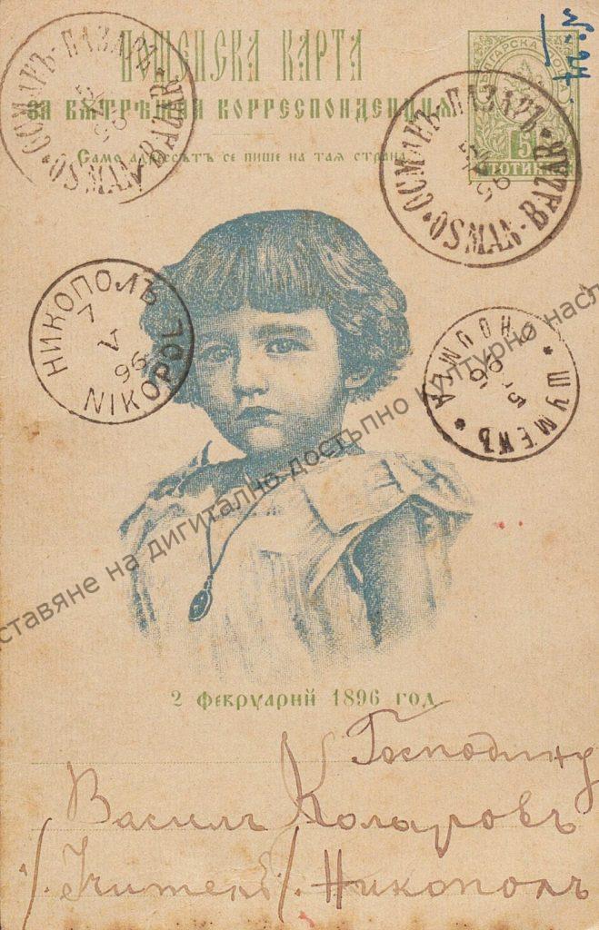 Пощенска картичка до В. Коларов в Никопол, април 1896 г. изпратена от Осман Пазар от Иван Коларов. Размер 8/13,5.