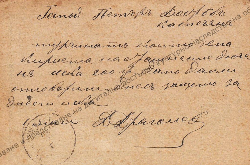 Пощенска картичка до Петър Добрев (бащата на В. Коларов) изпратена от Шумен от Д. Драгоев. Размер 8/13,5.