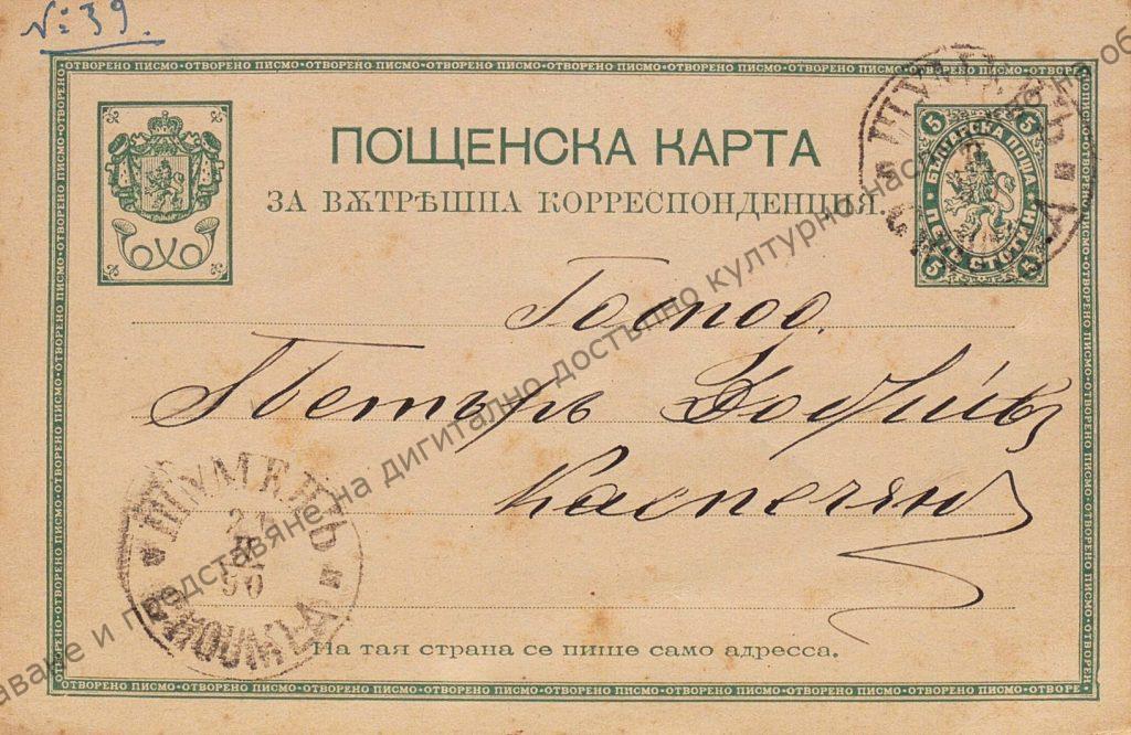 Пощенска картичка до Петър Коларов от Драгоев, Шумен, 20. II. 1890 г. Размер 8/13,5.