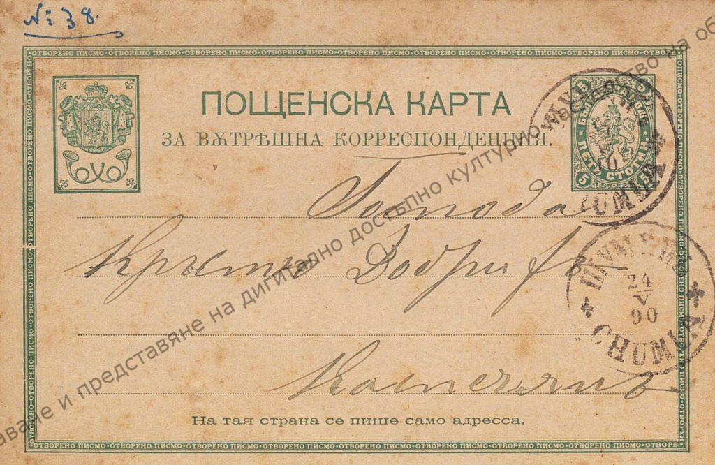 Пощенска картичка до Кръстю Добрев от Каспичан (брат на П. Добрев) от Петър Добрев, 18. V. 1890 г. Шумен. Размер 8/13,5.