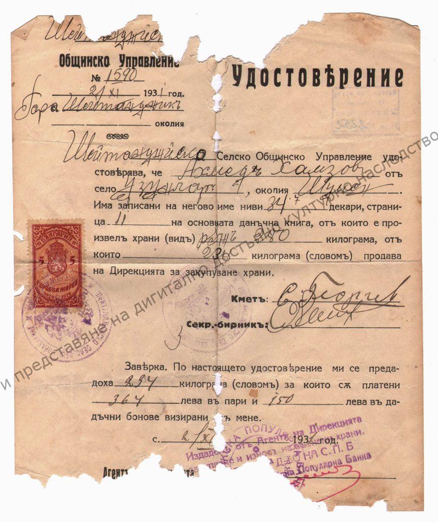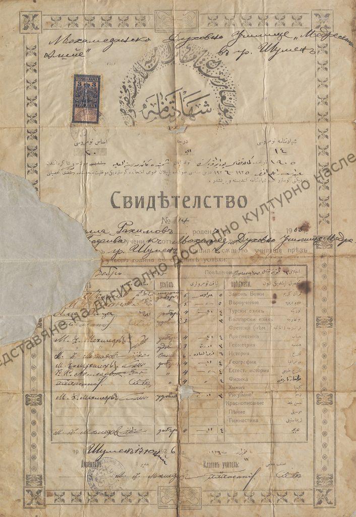 Свидетелство за завършено мохамеданско духовно училище „Медресета Айше“ в гр. Шумен на Рахимов 1926 г.