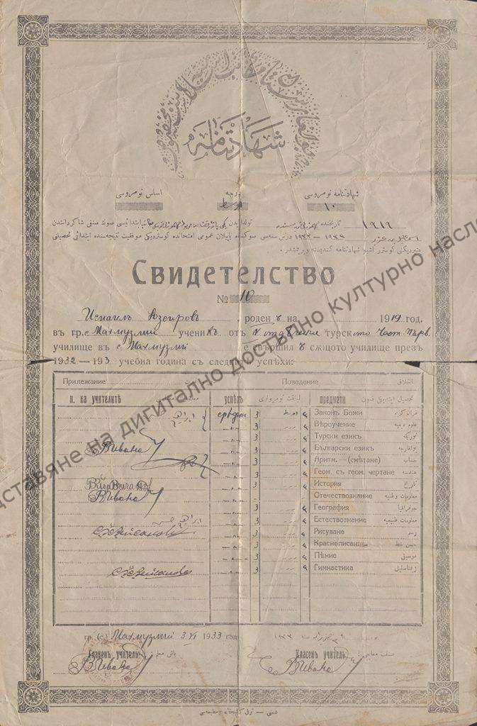 Свидетелство за завършено IV отделение на турското частно първоначално училище с Махмузлий на Исмаил Юзеров, 3 юни 1933 г.