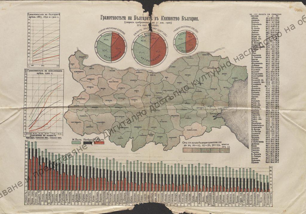 Карта с диаграми „Грамотността на Българите в Княжество България“ (според преброяването на 31. XII. 1900)