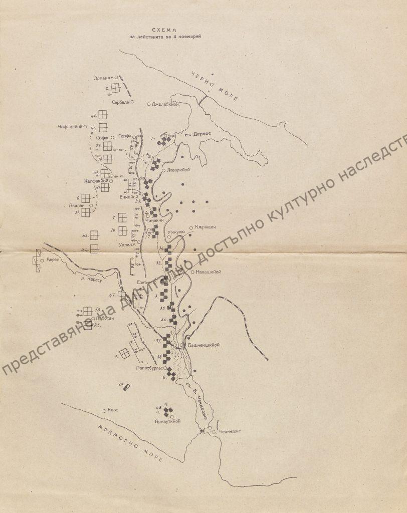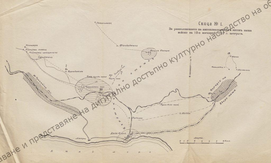 Скица за разположението на настъпающите от изток наши войски на 12 ноемврий 1912 г. вечерта.