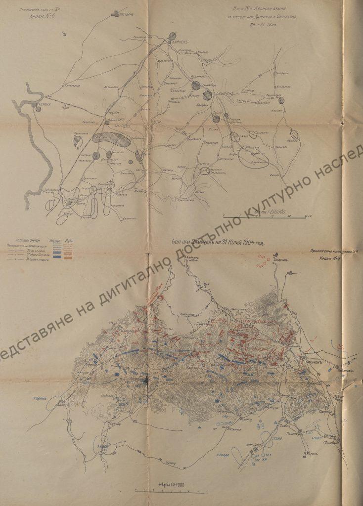 Карта На 1 лист 3 карти от РУСКО –ЯПОНСКАТА ВОЙНА: 2. II-та и IV-та Японски армии в боевете при Дашичао и Симучен 24-31 Юли; 3. Боя при Симучен на 31 Юлий 1904 г.
