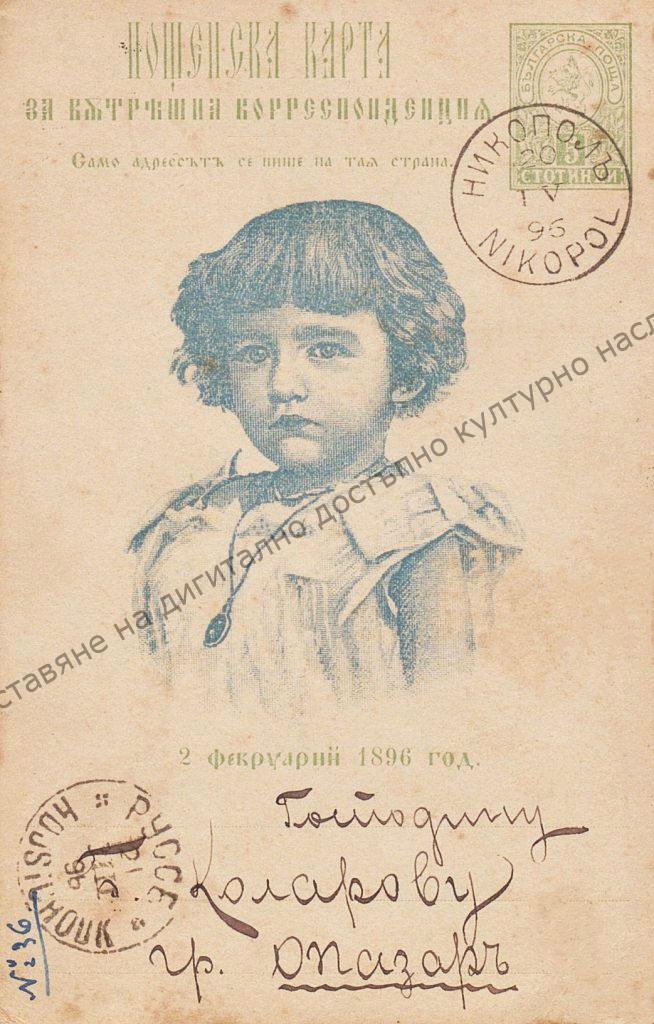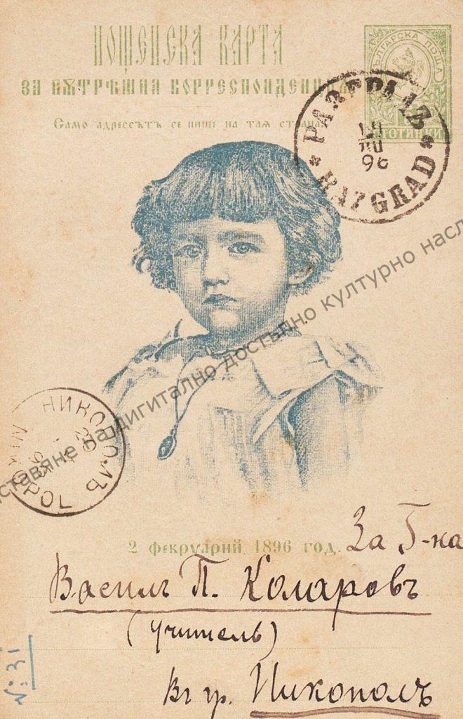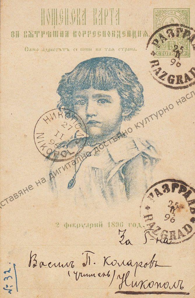 Пощенска картичка до В. Коларов учител в Никопол от Йордан Г. от Разград, 1896 г. На лицевата страна на картичката е нарисувано в синьо малко момиченце. Размер 13/8,5.