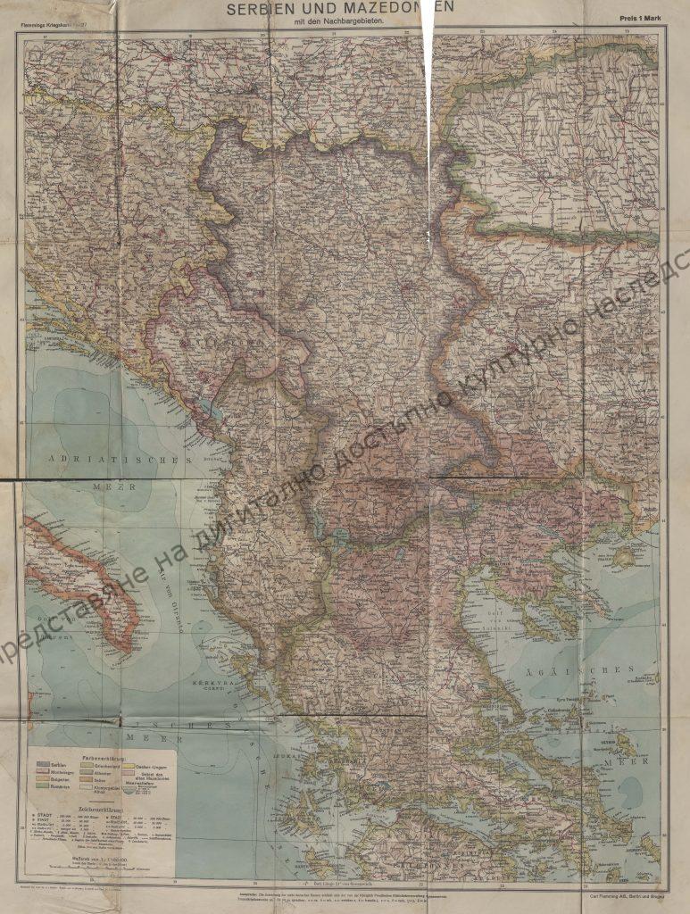 Карта SERBIEN und MAZEDONIEN, nit den Nachbargebieten. Flemmings Krregskrte № 27, Preis i Mark