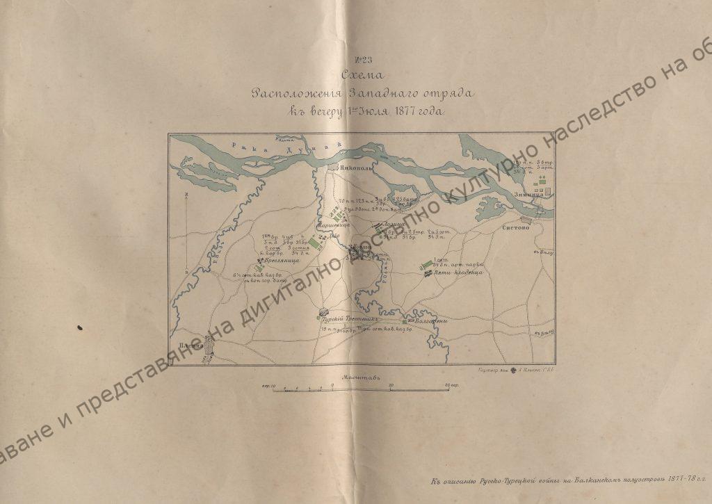 Карта, 1 лист, 4 карти: 4 – № 23 – Схема Расположенiя Западнаго отряда к вечеру 1 юли 1877 г.