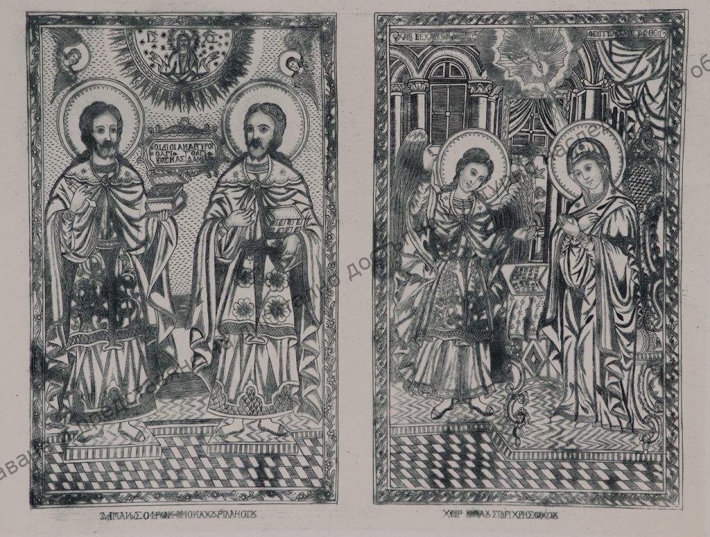 Renaissance engravings of the 19th century, Rila Monastery, “Saints Damian and Cosmas”, “Annunciation”