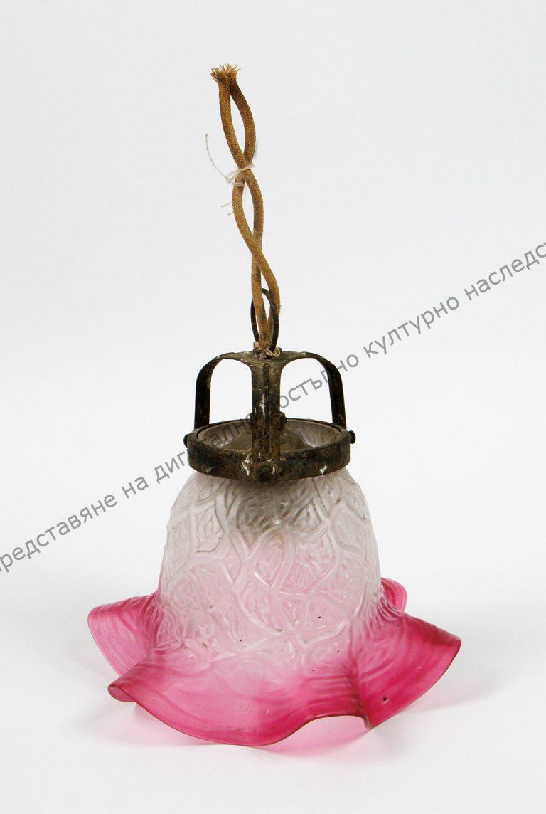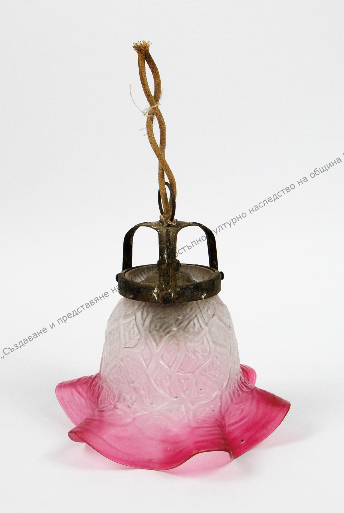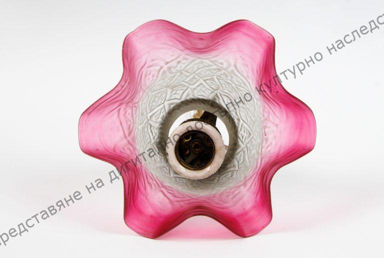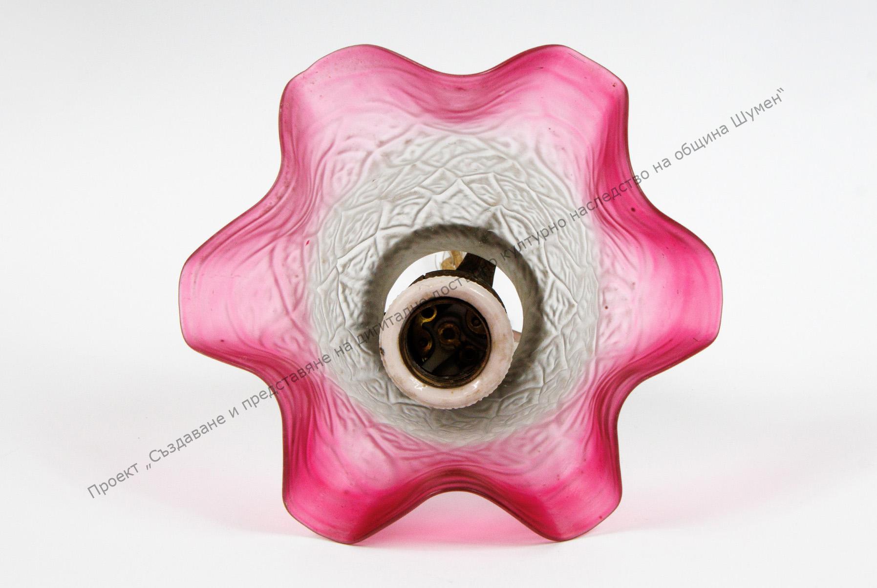Изработен от матово стъкло в бяло и наситено розово по края. Камбановидна форма с релефна украса