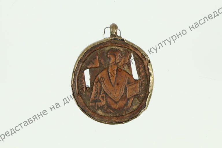 От дърво, с кръгла форма с метална обковка по края. Релефно изображение на религиозни образи на двете страни