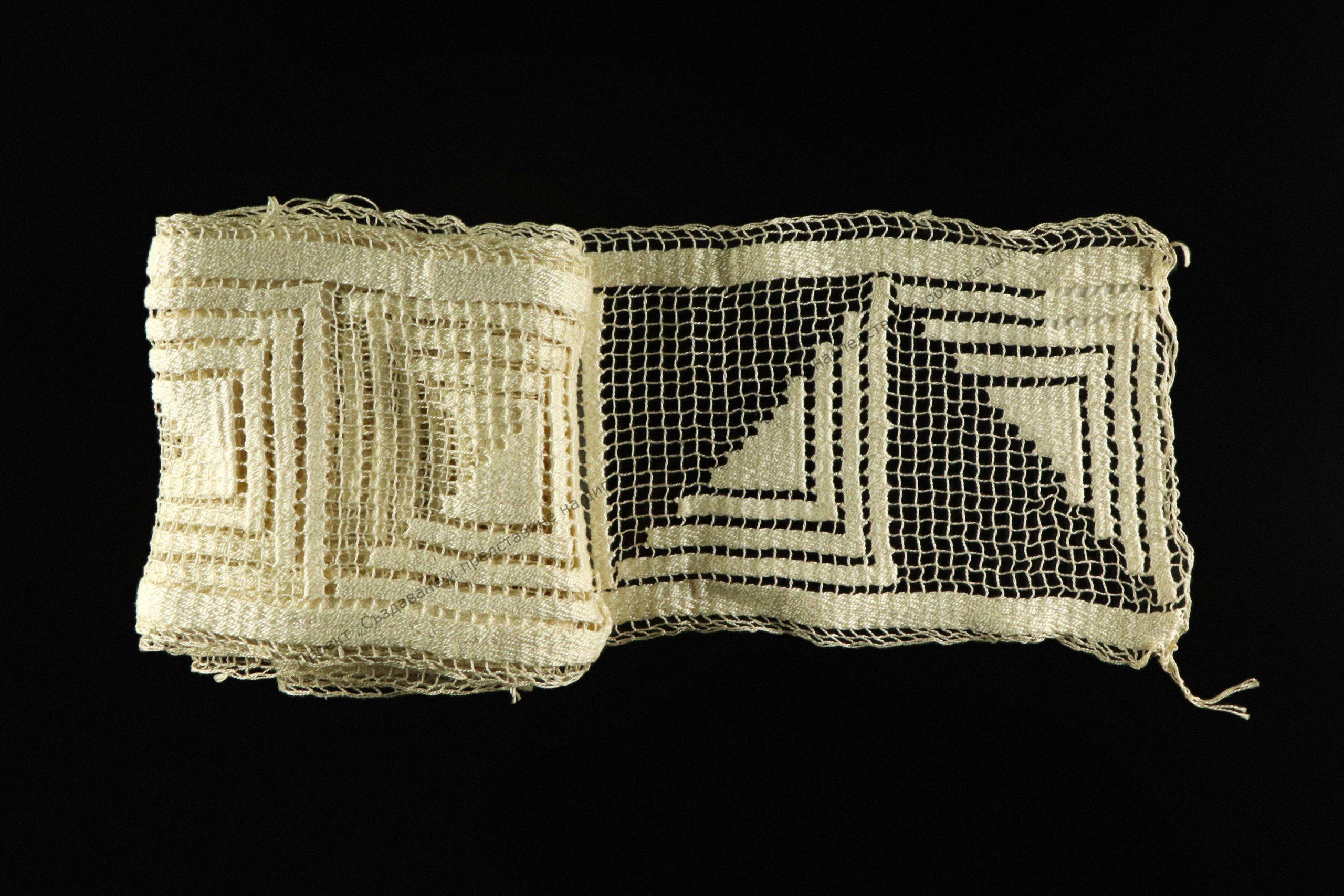 Изработено около 1930 г. за възглавница, на 1 кука от тънки бели памучни конци