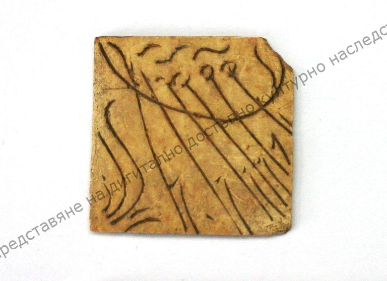 Апликация, кост. И двете повърхности обработени, като външната е гладка с врязан растителен орнамент върху цялата площ