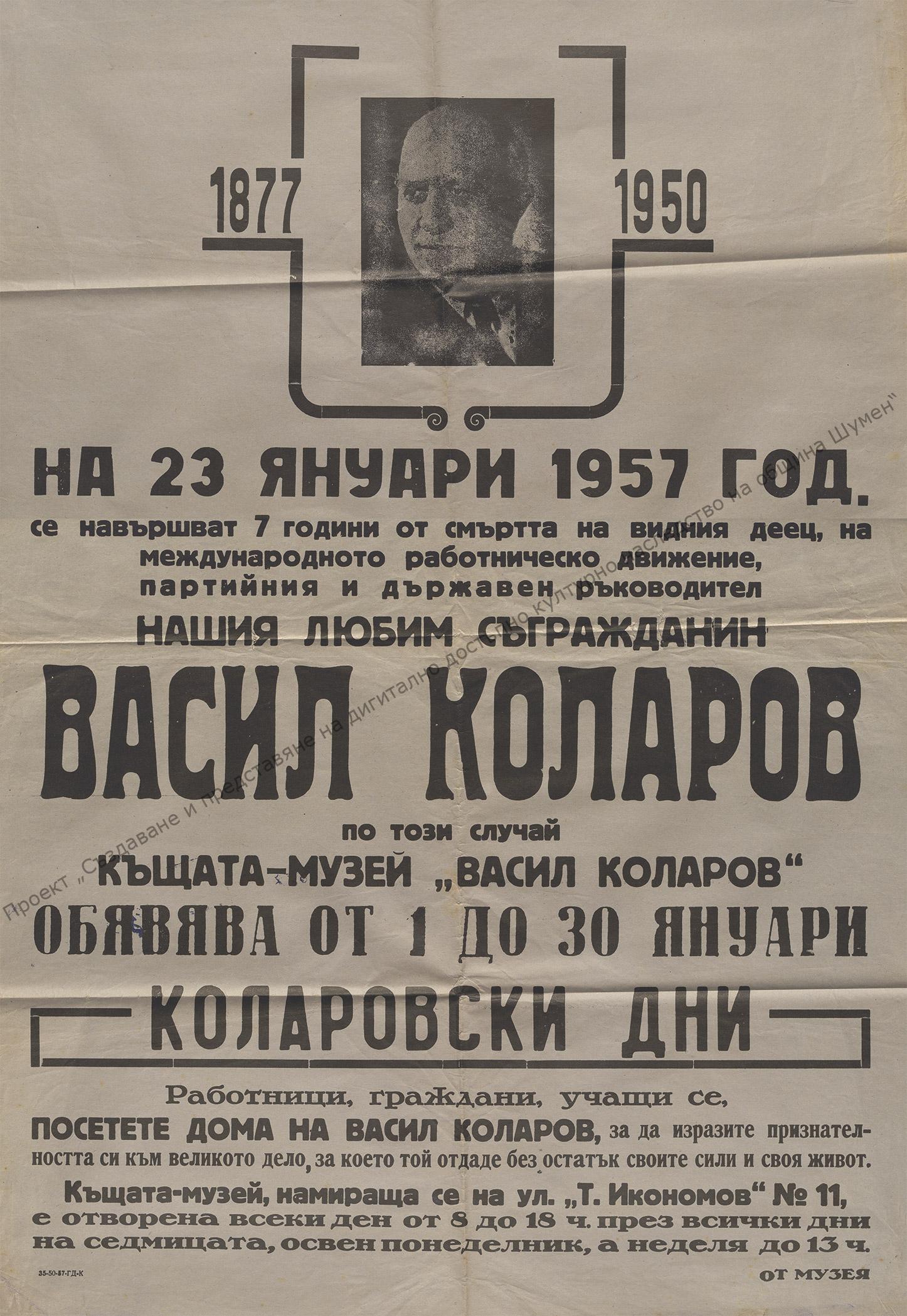 Издаден от къща музей „В. Коларов“, с който се обявяват дните от 1 до 30 януари за Коларовски, 1957 г.