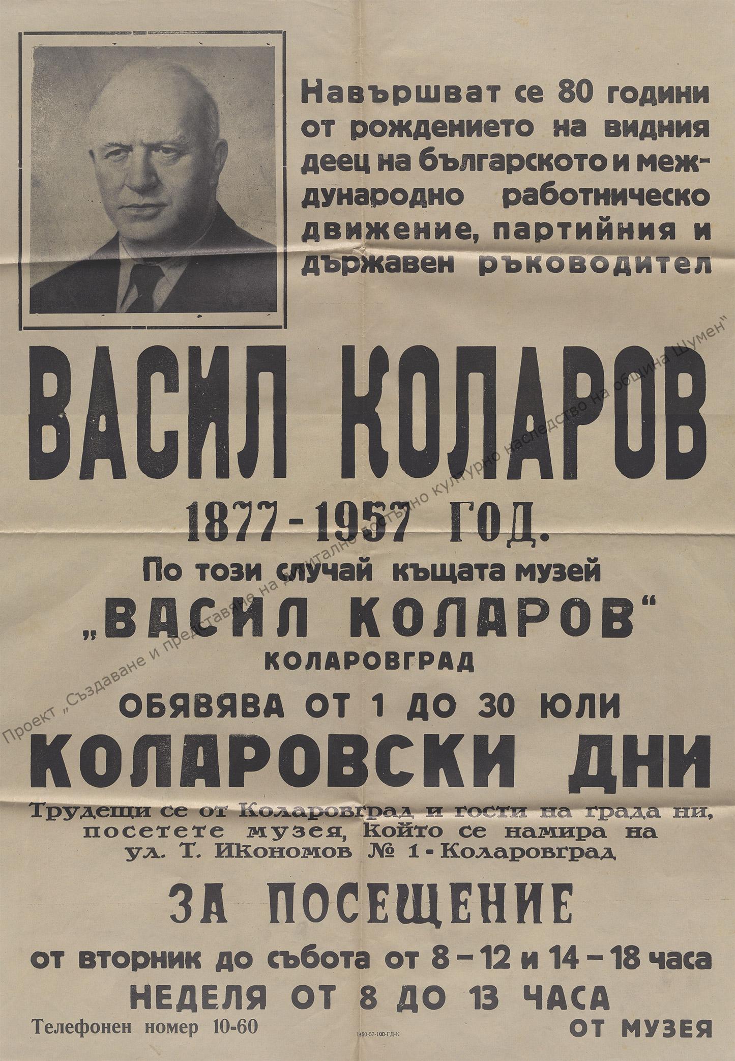 Издаден от къща музей „В. Коларов“ в чест на 80 годишнината от рождението на В. Коларов. 1957 г.