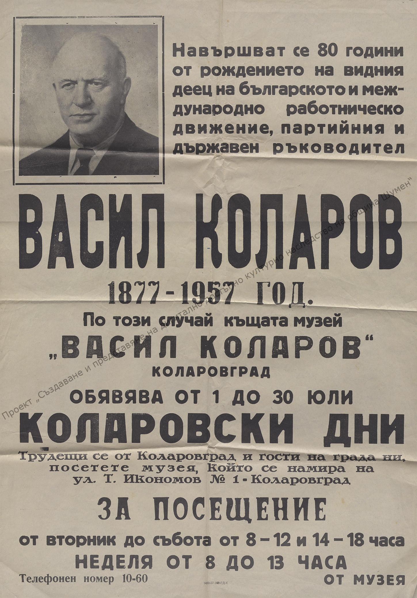 Издаден от къща музей „В. Коларов“, с който дните от 1 до 30 юли 1956 г. се обявяват за Коларовски по случай 80 години от рождението на В. Коларов, 1957 г.