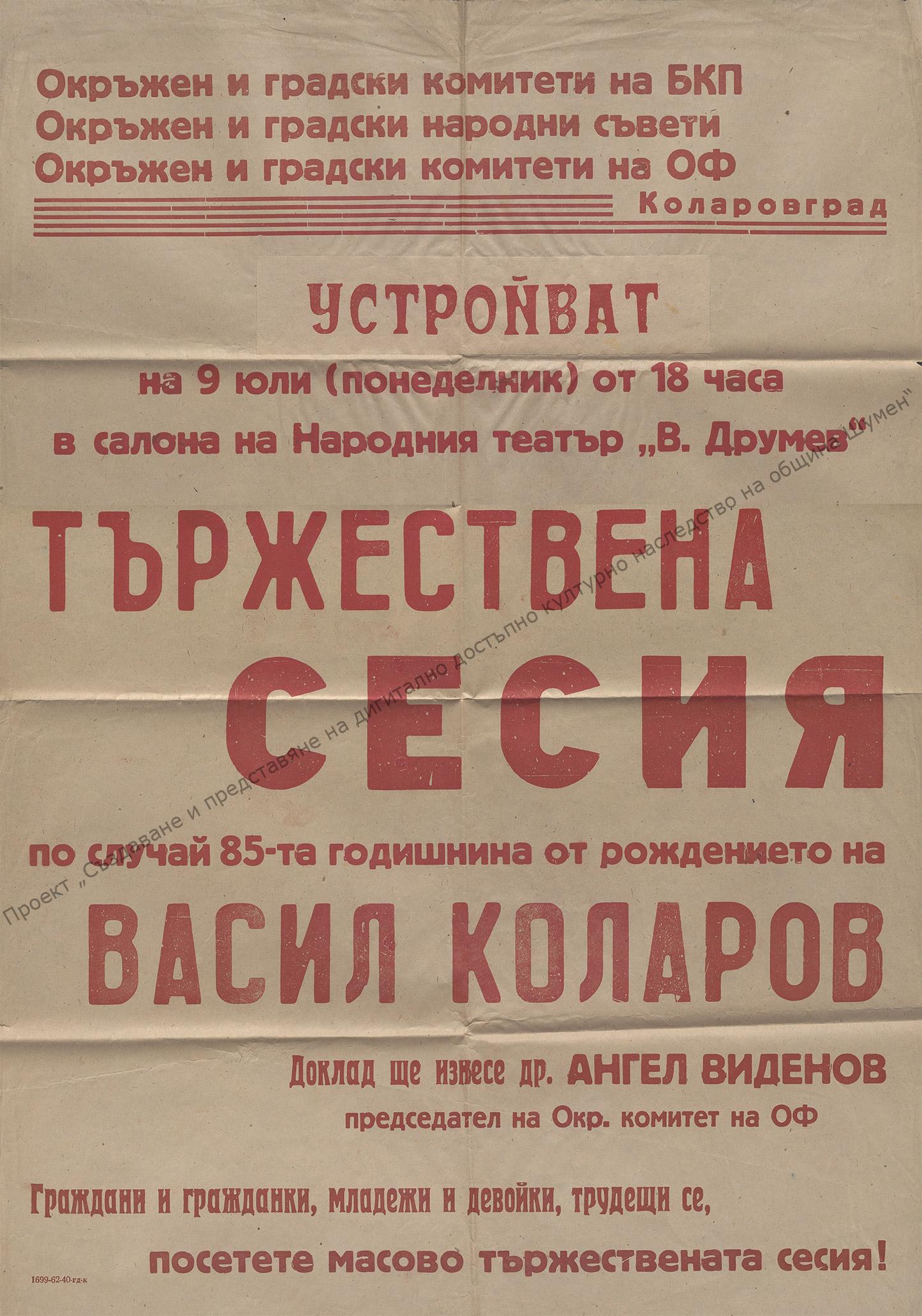 Афиш за организиране на тържествена сесия по случай 85 години от рождението на В. Коларов