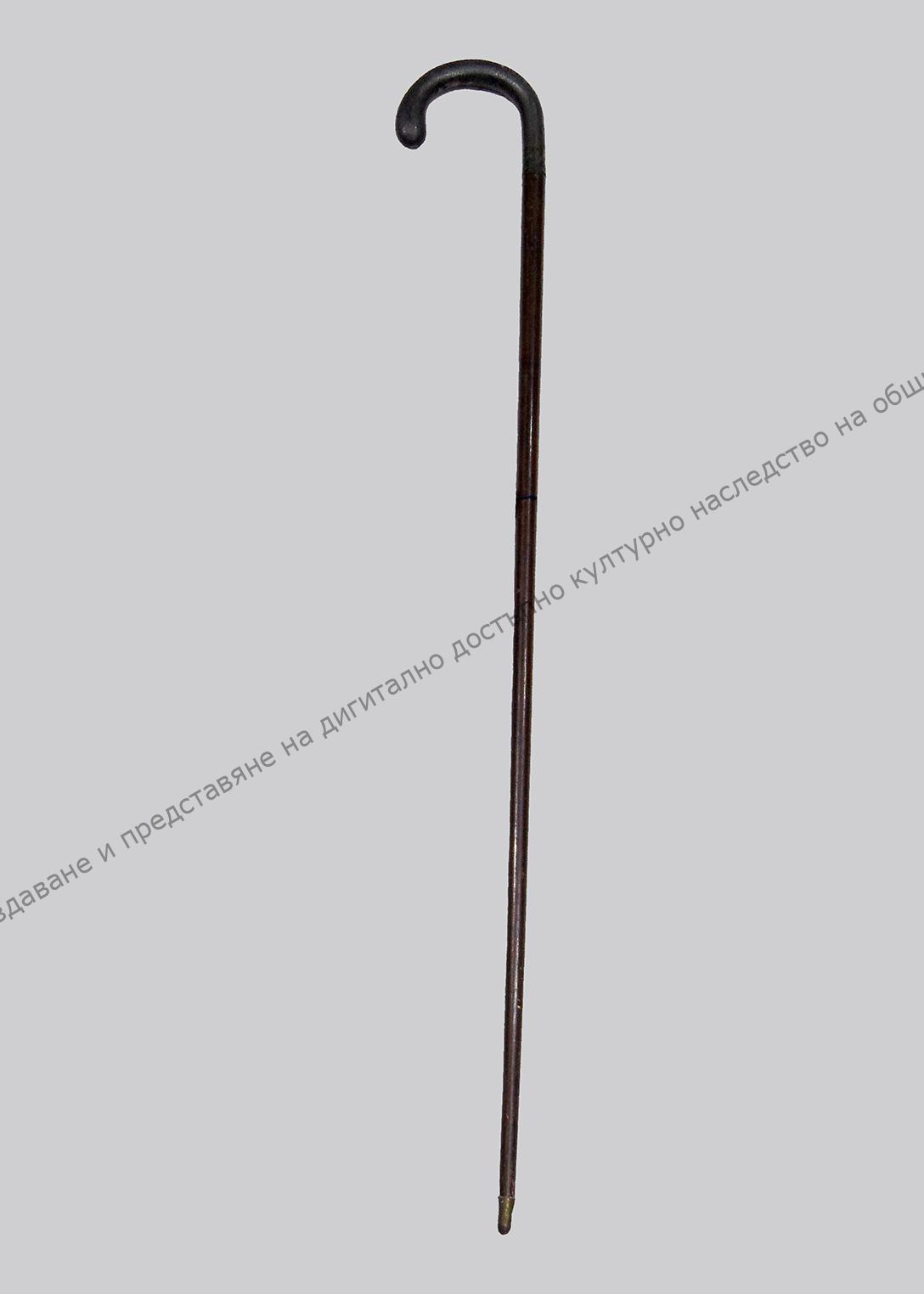 От полирано дърво. Дръжката обкована с метален лист, украсена с растителни орнаменти. Принадлежал на богато турско семейство