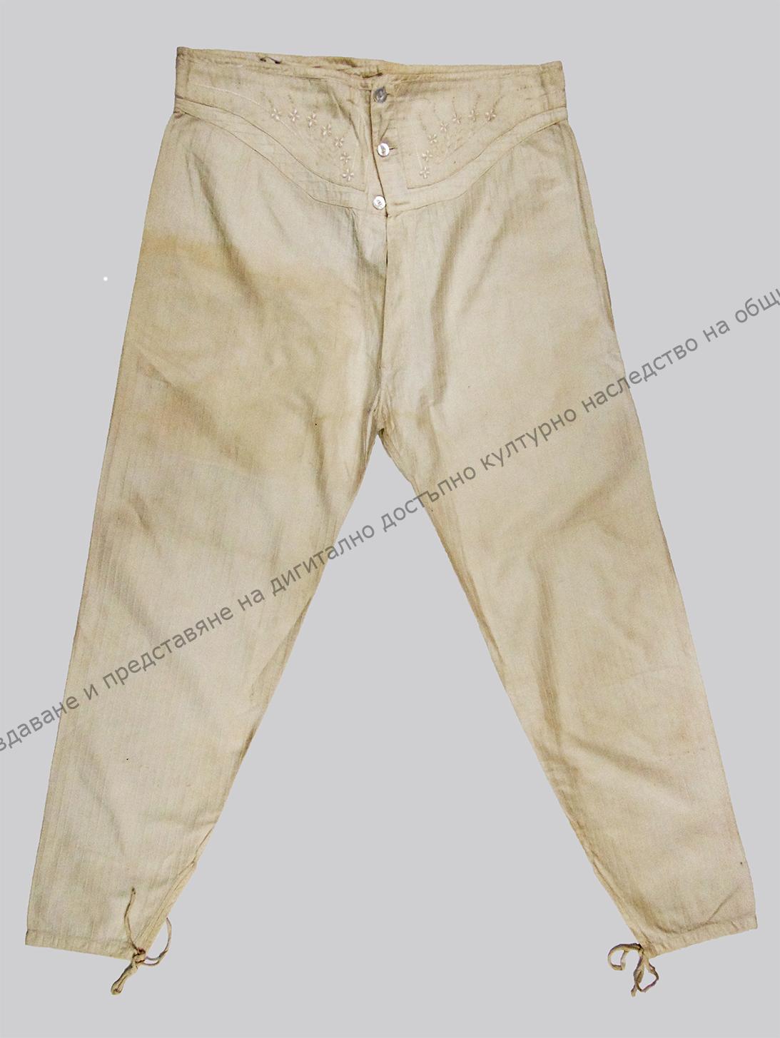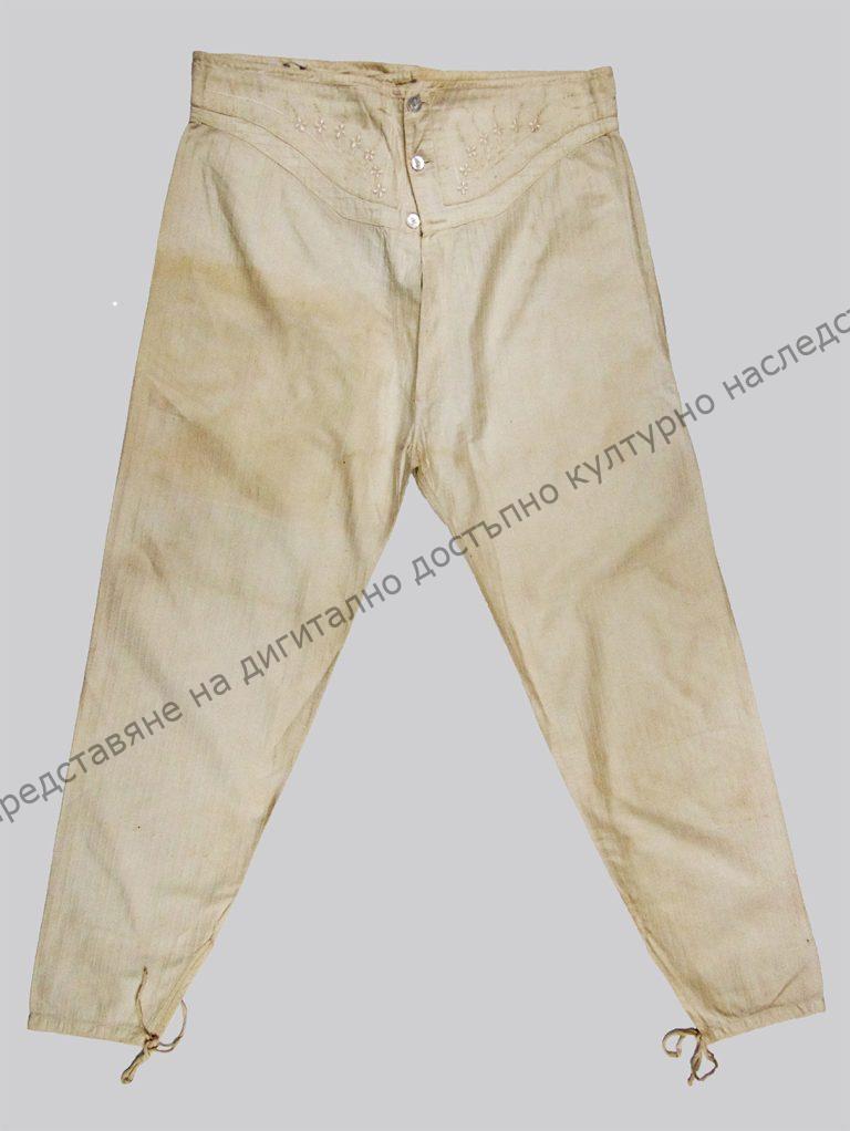Мъжко, от бяло памучно, фабрично платно – рипс. На колана избродирани растителни орнаменти. Седефени копчета. Направени са за дар на младоженеца. Носени до към 1944 г., след което модата се променя