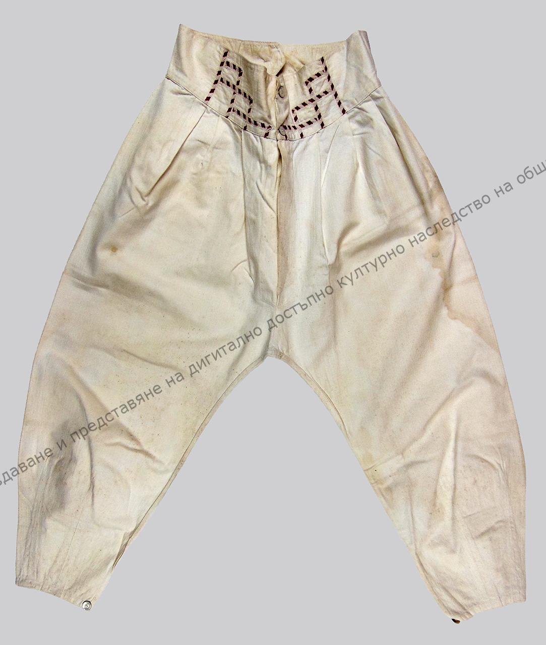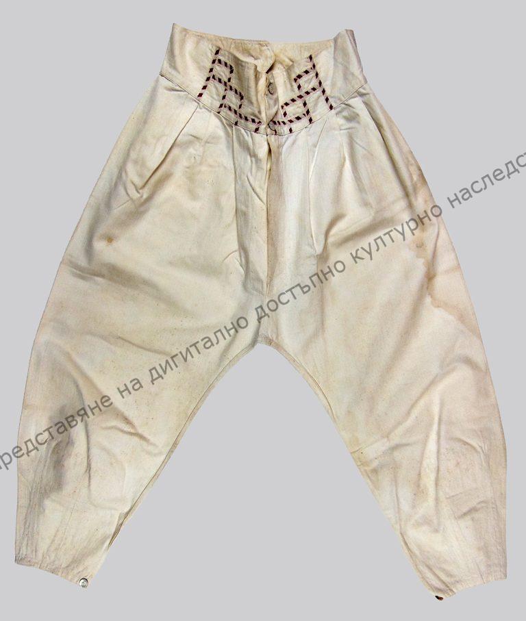 Мъжко, чеизено. От бял рипсен фабричен плат. Широк колан обшит с орнаментиран ширит, седефени копчета. Ушити около 1900 г.
