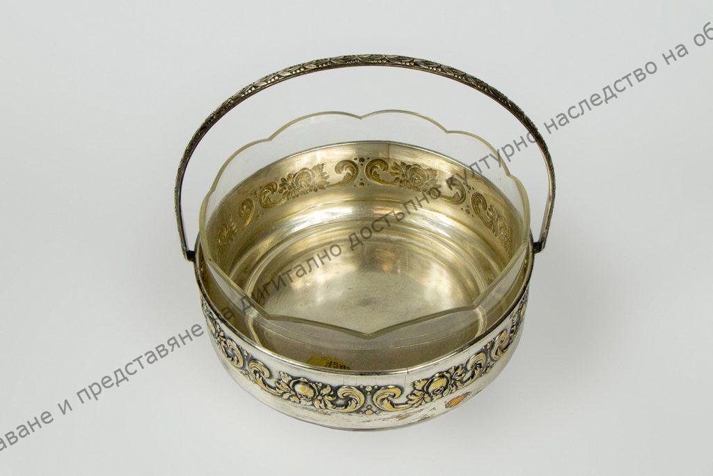 Диаметър дъно 13,7 см, диаметър отвор 15,5 см, височина 5 см. Стъклен съд: дъно 11,6 см, отвор 14,7 см, височина – 6,5 см