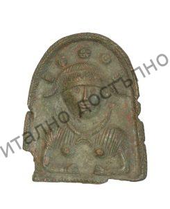 Бронзова плочка с пирамидална форма. Представя женски бюст en face, облечен с хитон с къси ръкави и с гривни на двете ръце. Върху шията има торква с кръгли висулки. Върху главата корона с украса. Намерена в с. Опака (Поповско). Доставена от Енчо Ангелов през 1936 г.