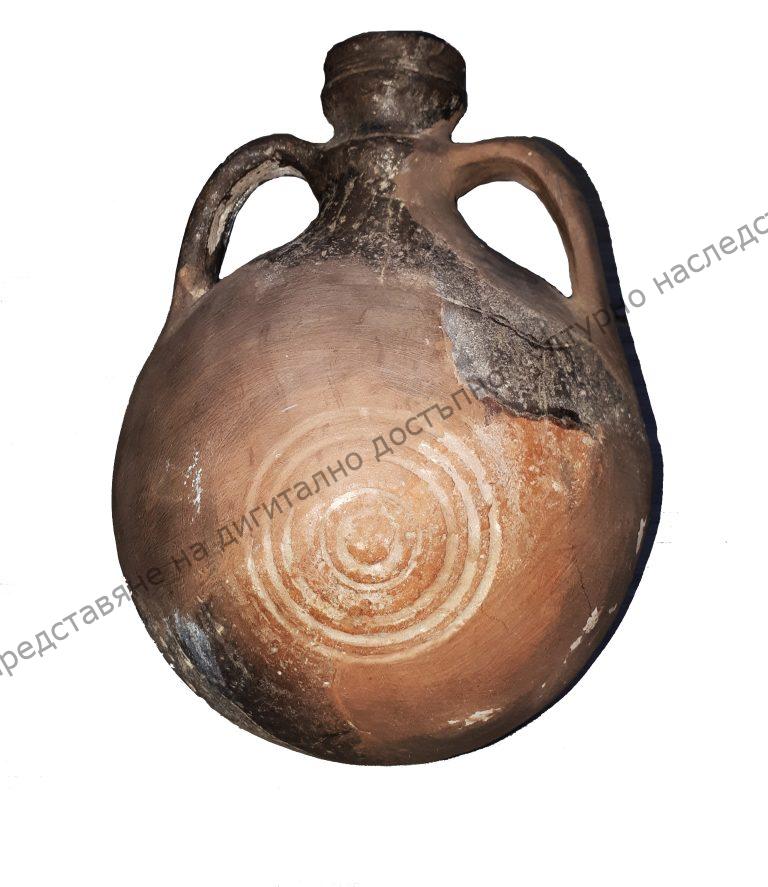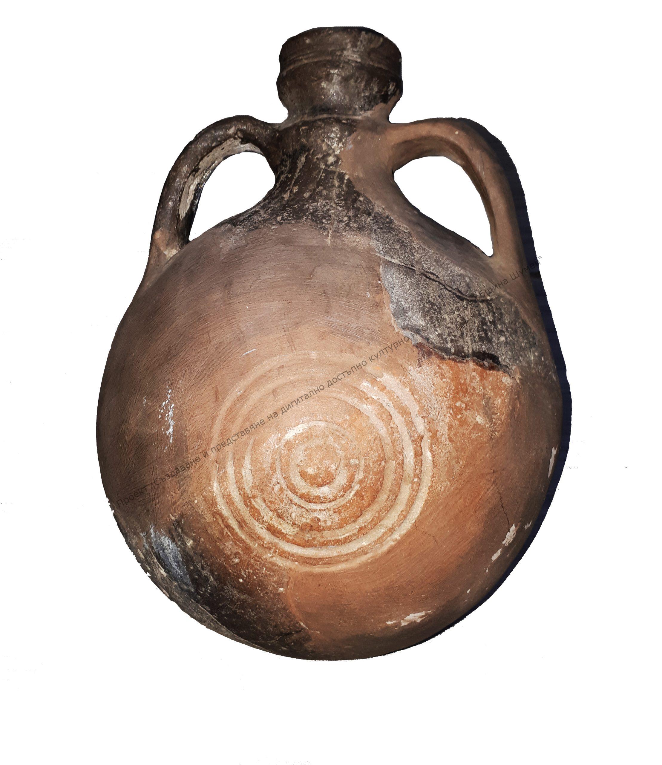 От червено-кафява глина. Тялото е сферовидно, изпъкнало от едната страна, а от другата е украсено с концентрични кръгове. Профилирано устие