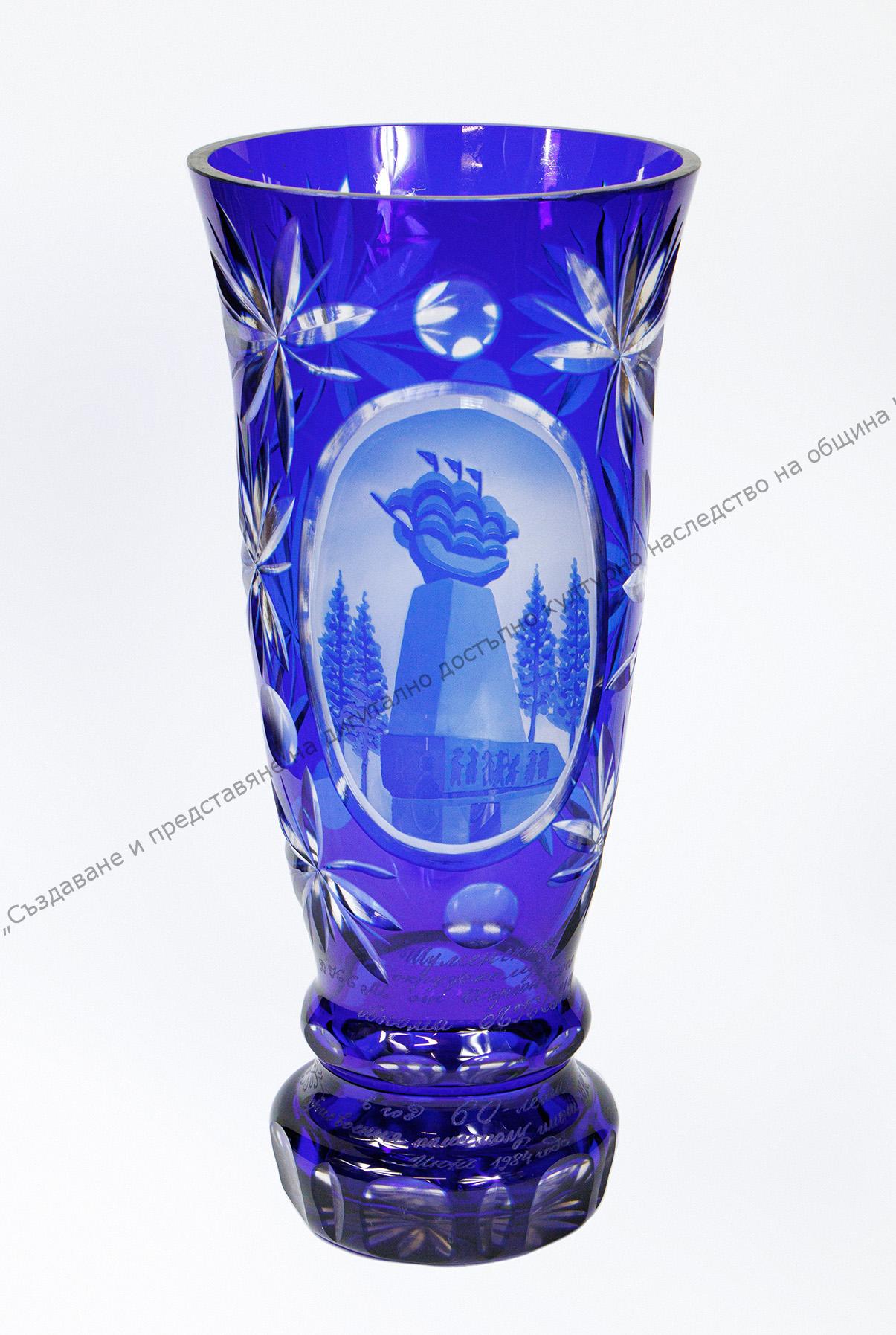 Изработена от оловен кристал в синьо, с инкрустирани цветя. Изобразен е паметника на първия кораб в Херсон и надпис на руски език.