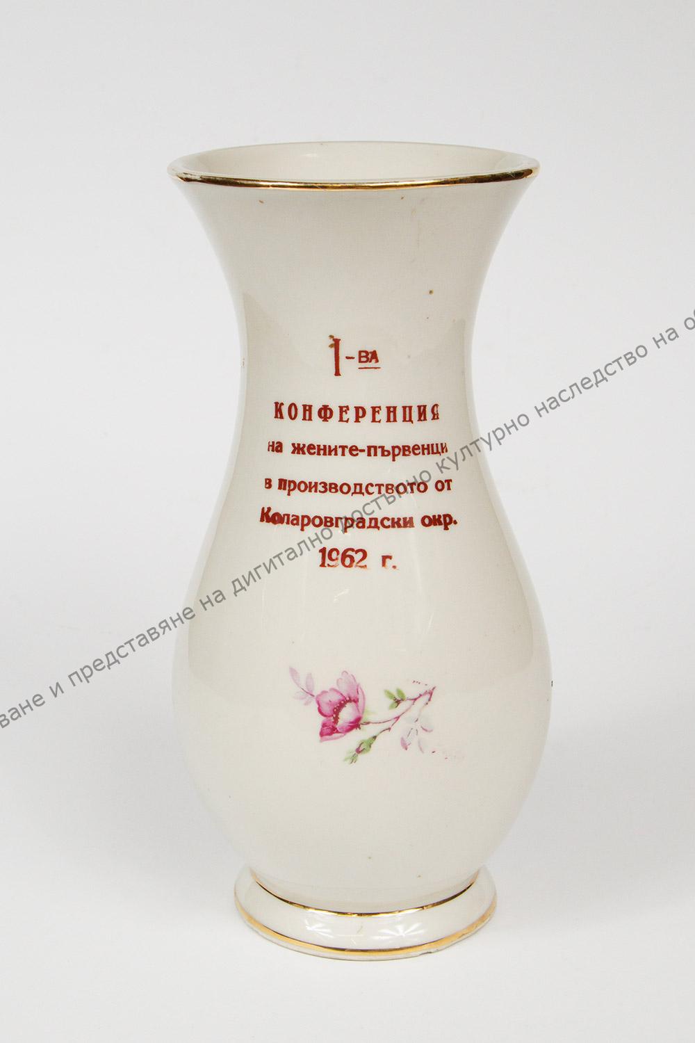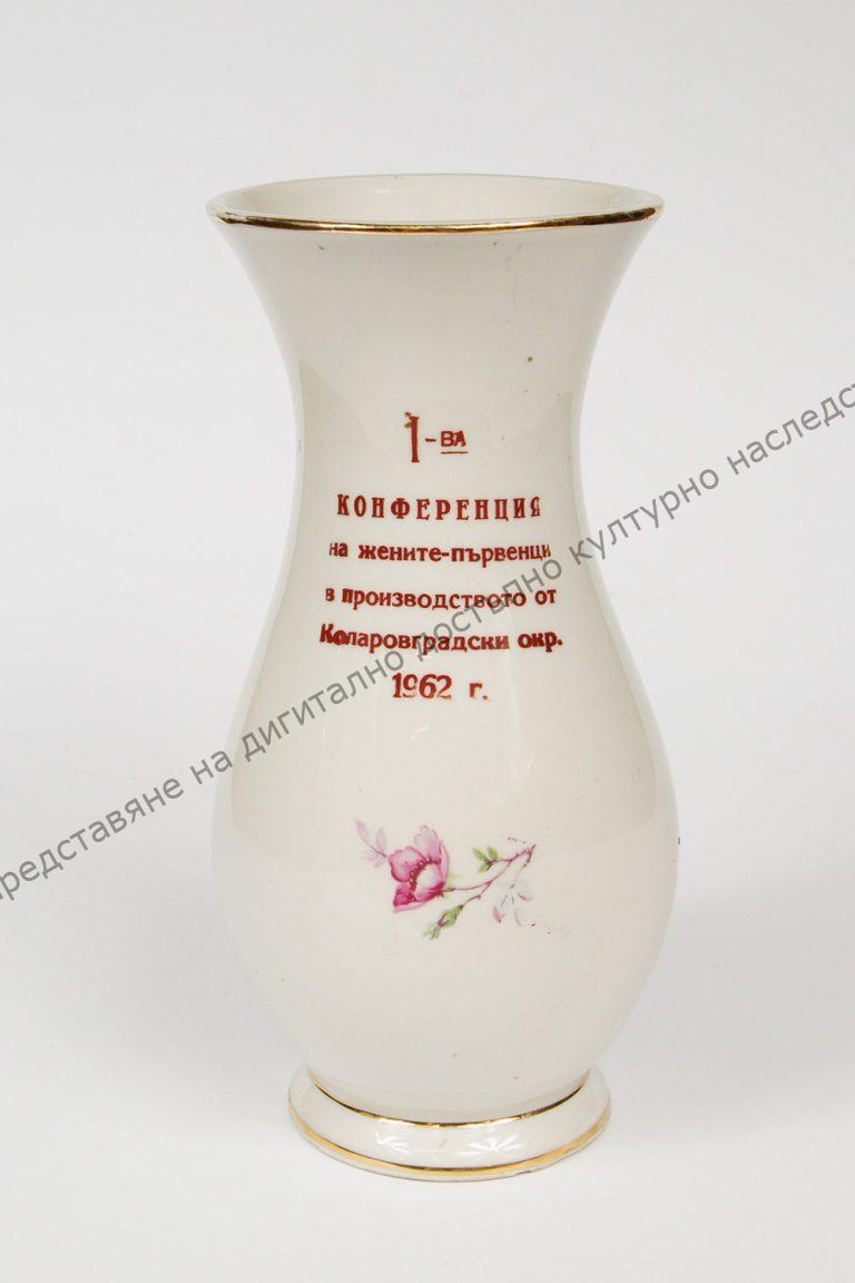 От порцелан. Подарена на Неделка Живкова, от участниците в първата конференция на жените – първенци в производството от Коларовградски окръг – 1961 г.