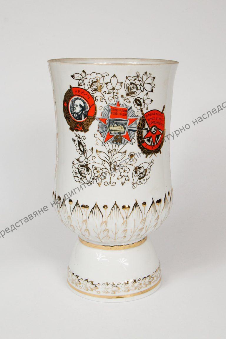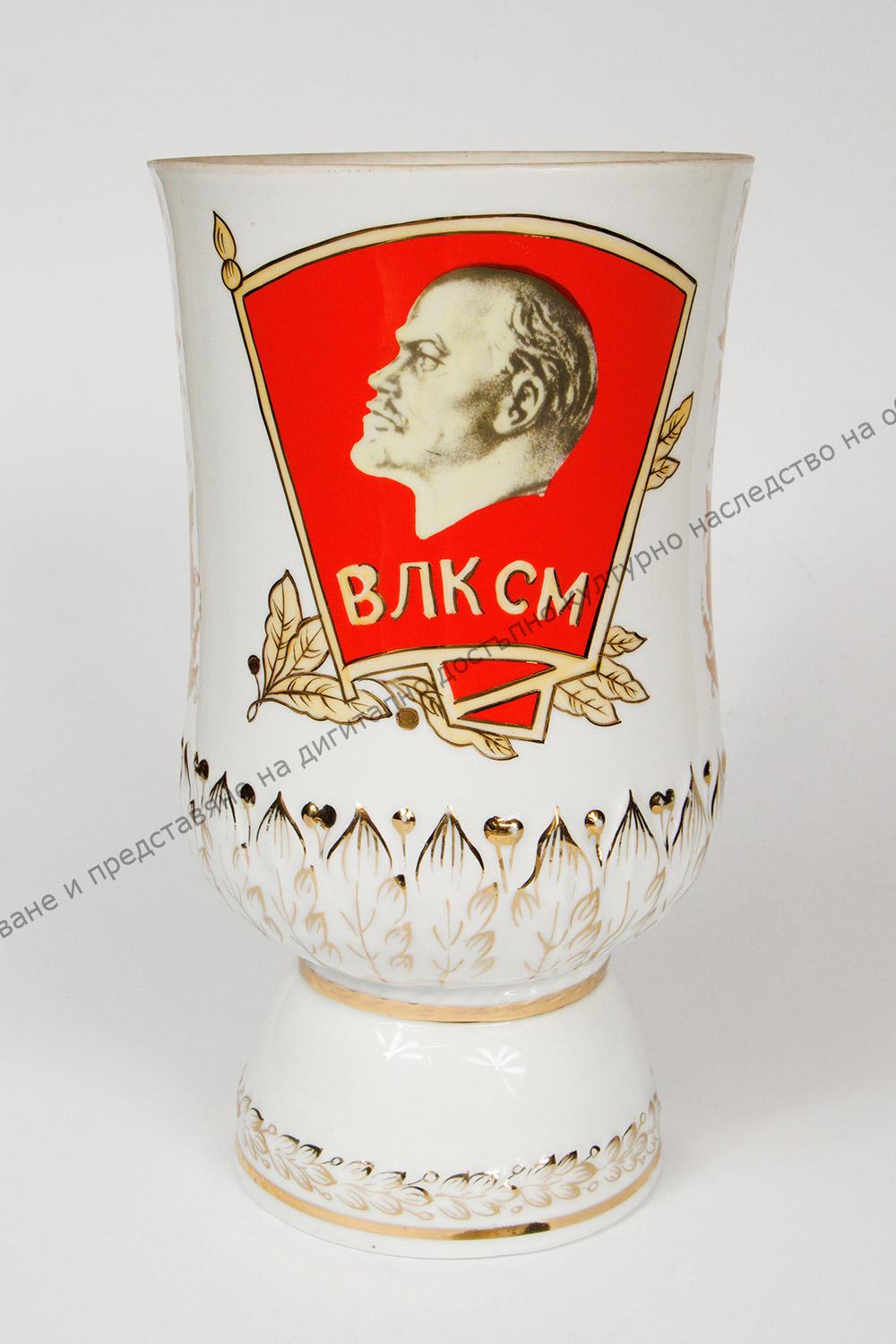 От порцелан. Има украса от образа на Ленин, значка с кораба ,,Аврора“, комсомолската значка с надпис ВИКСМ.