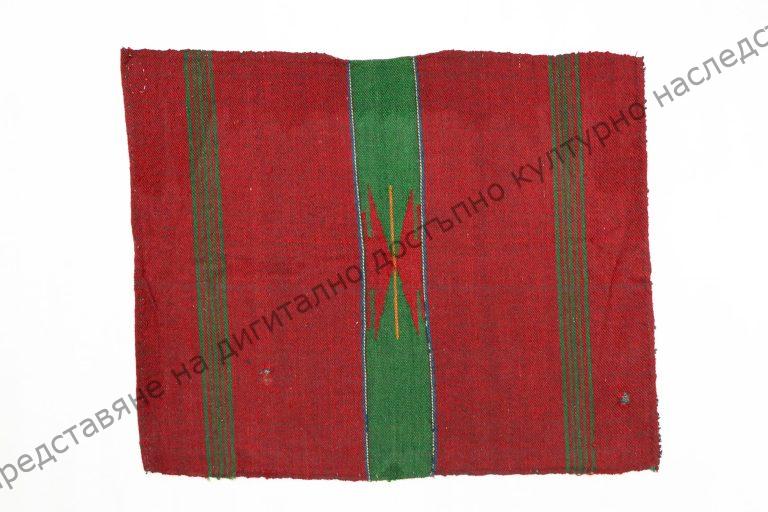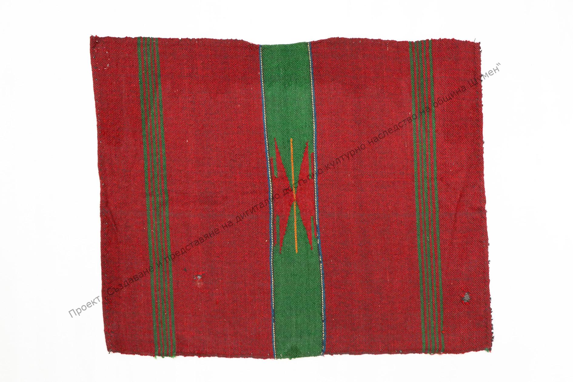 От вълна и памук. Домашно тъкана димитно на едноцветни ивици, в средата украса от късана фигура, началото на XX век за чеиз