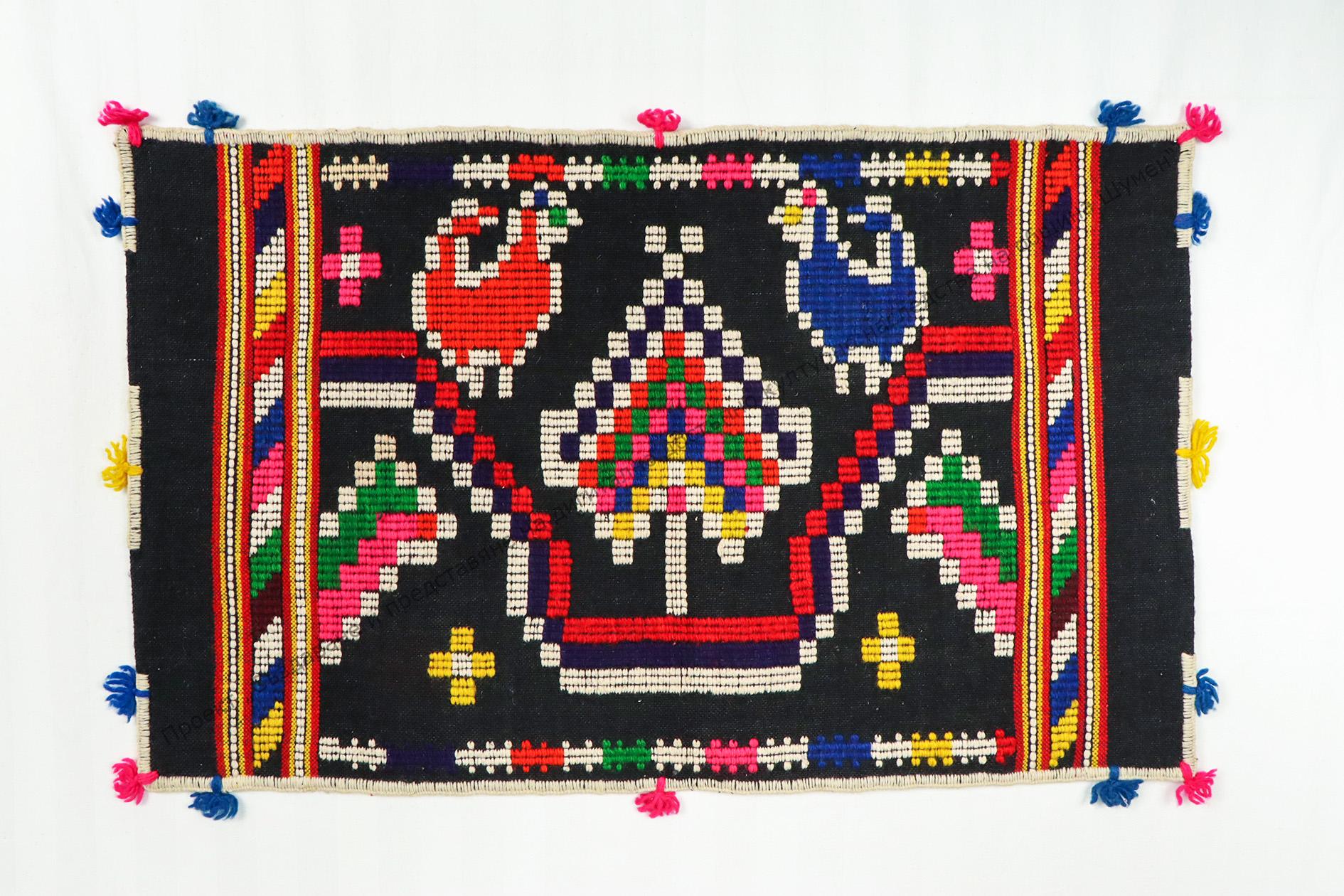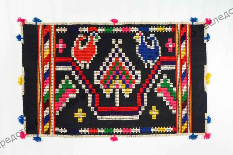 От вълна. Домашно тъкана „вадена“, с нашити растителни, животински и геометрични мотиви, с украса от пискюлчета в ъглите