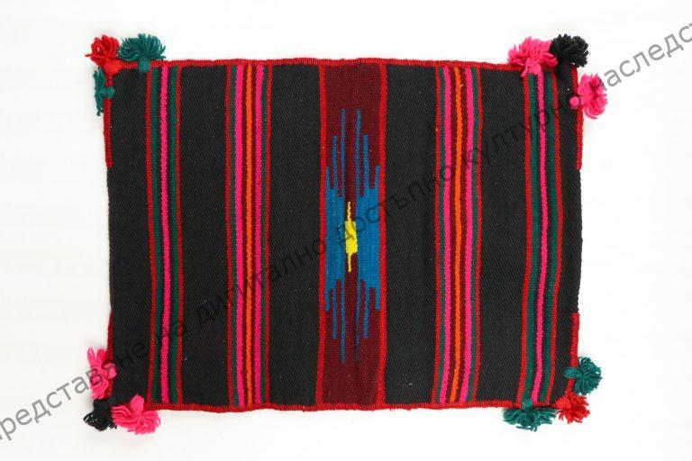 Of wool. Home-woven, quadruple, in multi-colour stripes, in the middle interwoven figure, with decoration – tassels at the corners, circa 1928, for trousseau
