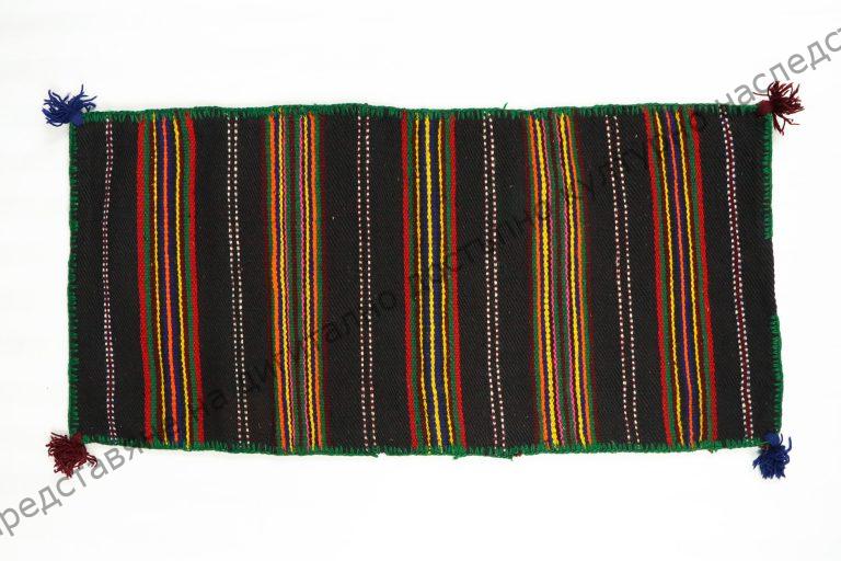 От вълна. Домашно тъкана диметно на разноцветни ивици, с украса от пискюли в ъглите, около 1943 г. за чеиз