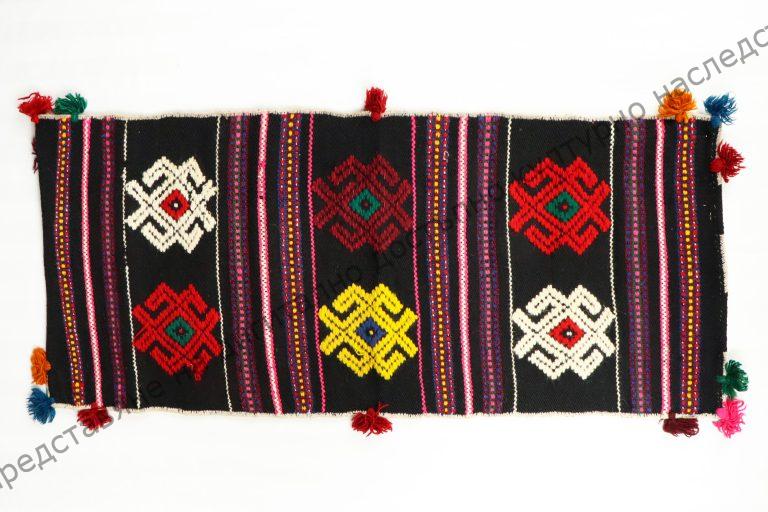 От вълна. Домашно тъкана на разноцветни ивици, с втъкани между тях фигури, с украса от пискюли в ъглите и средата, първата четвърт на XX век