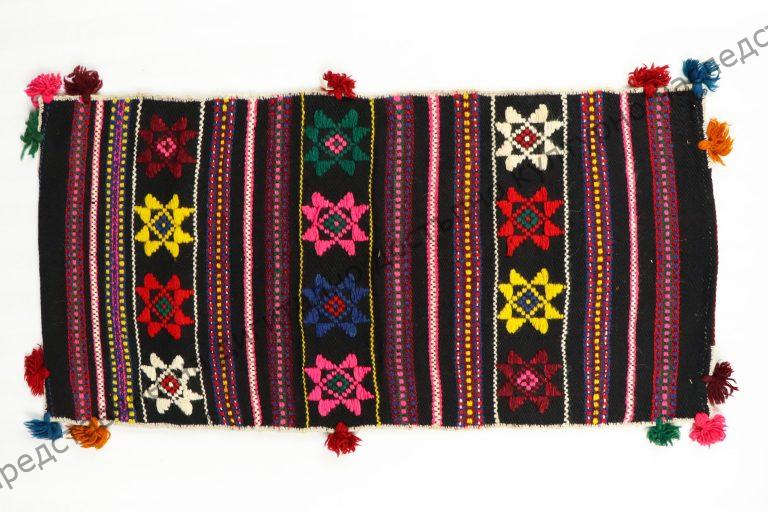 Of wool. Home-woven in multi-colour stripes, between them interwoven figures, decoration – tassels at the corners and in the middle, the first quarter of the 20th century
