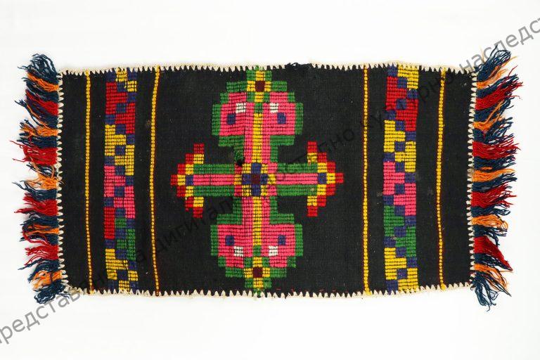 Of wool. Home-woven, with interwoven geometric figures, decoration – multi-colour fringes on the short sides, for trousseau