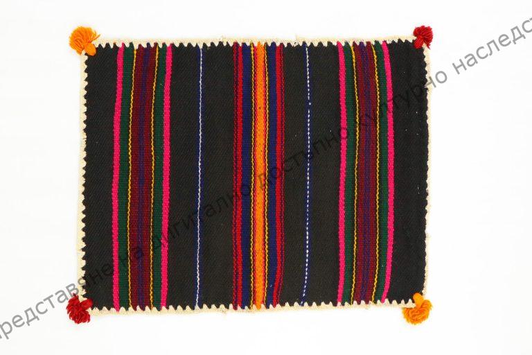 От вълна. Домашно тъкана диметно на разноцветни ивици, с украса от пискюли в ъглите, първата половина на XX век