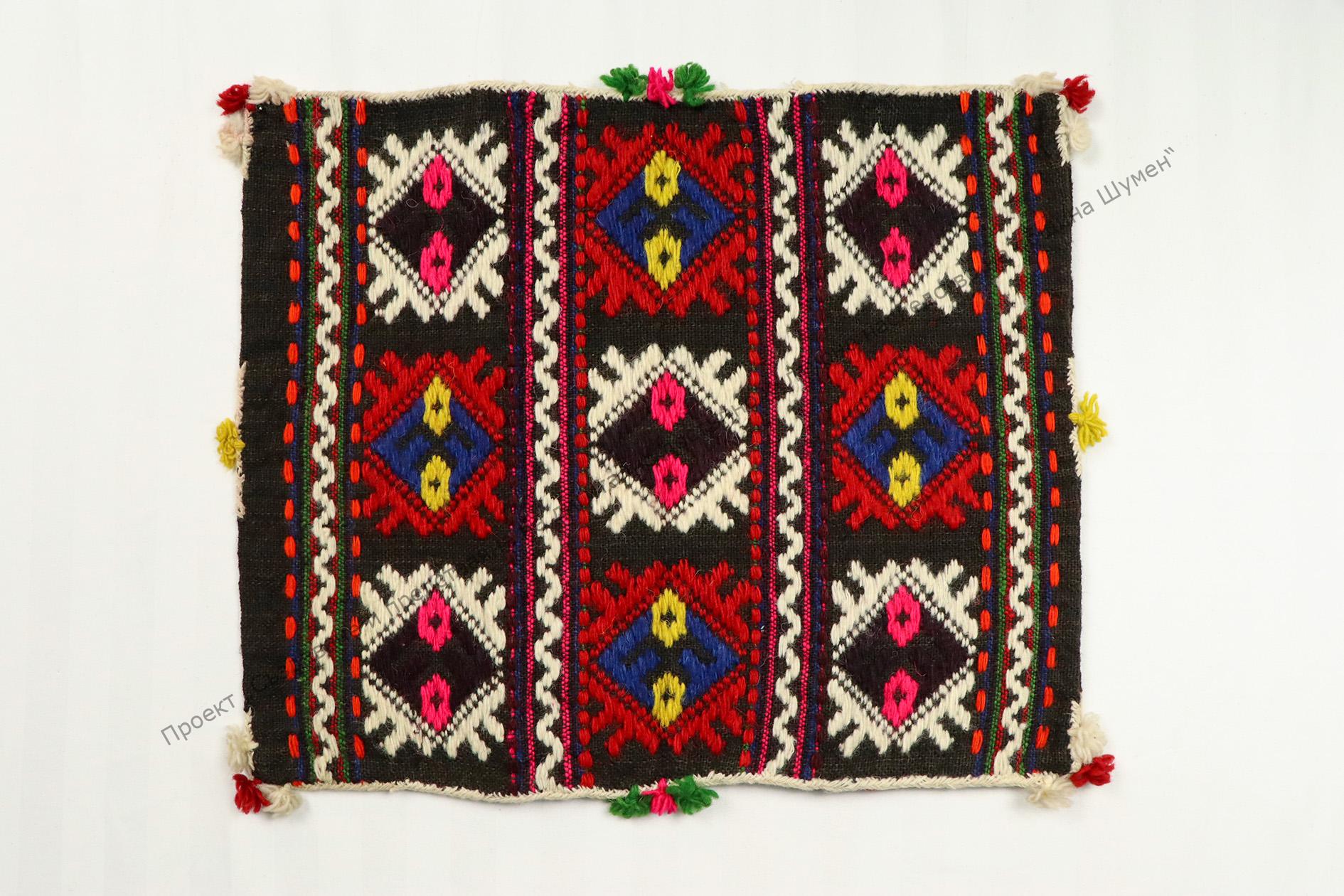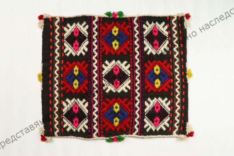 От вълна. Тъкана по техниката „дигани“ редове на разноцветни геометрични фигури, украса от пискюли в краищата и средата, началото на XX век