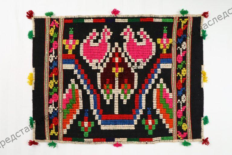 От вълна. Домашно тъкана на разноцветни ивици в двата края, между тях начупени фигурки. В средата украса от нашити птичета, в краищата – пискюли , 30-те години на XX век