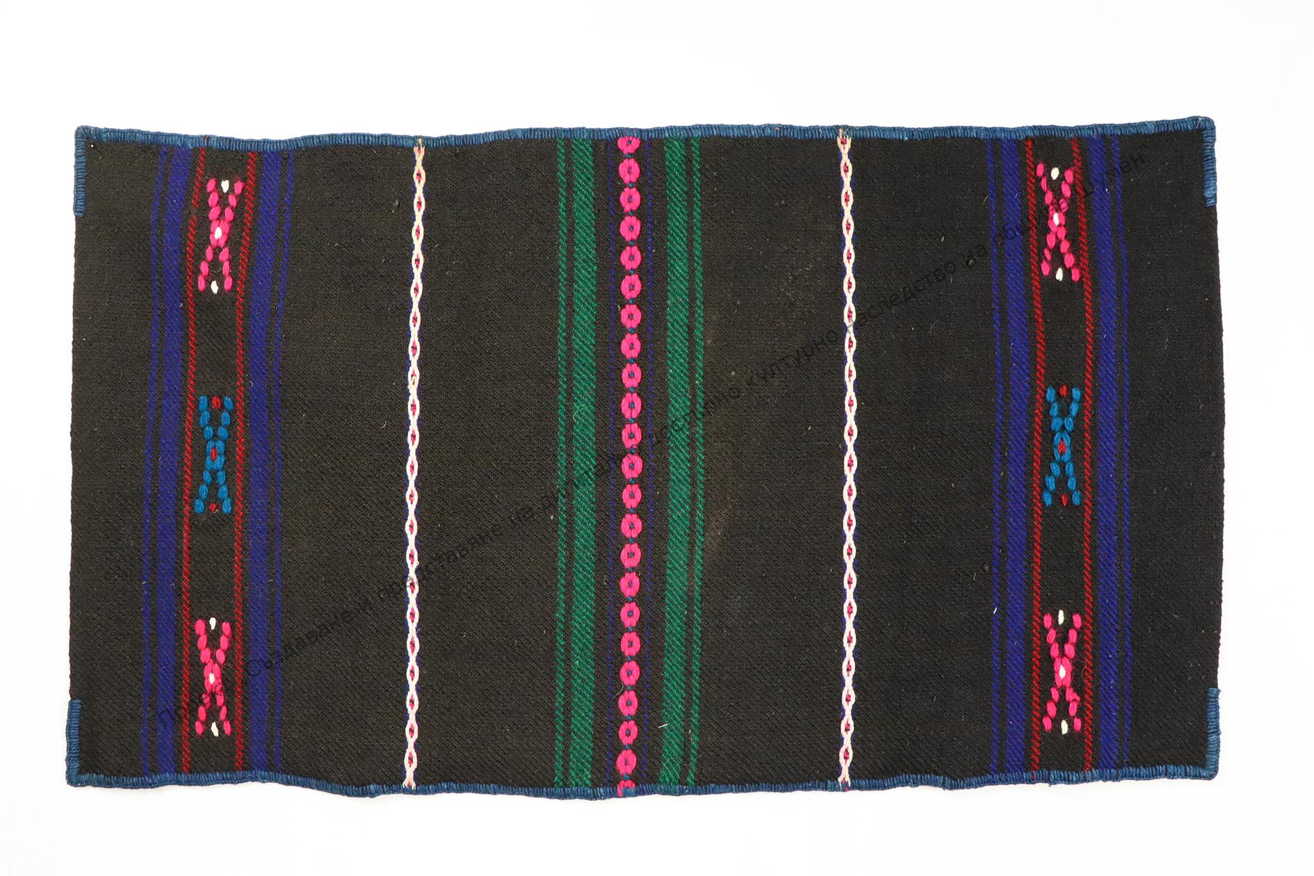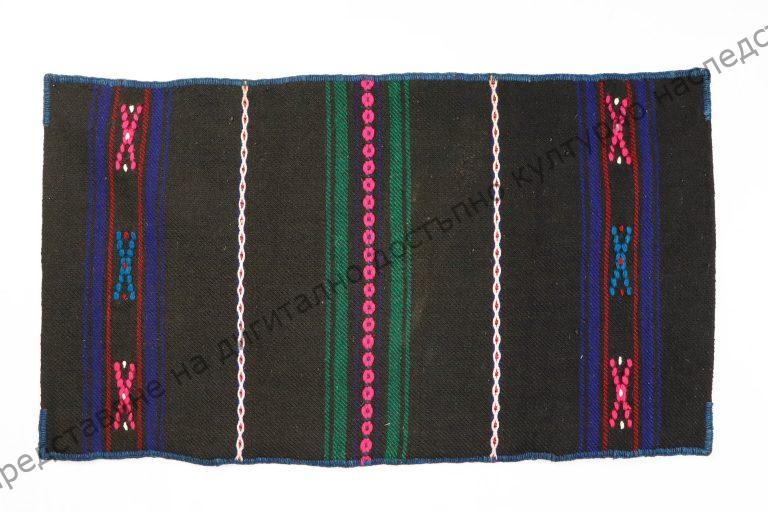 От вълна. Домашно тъкана димитно на разноцветни ивици, между тях нашити хиксовидни фигури, около 20-30-те години на XX век за чеиз