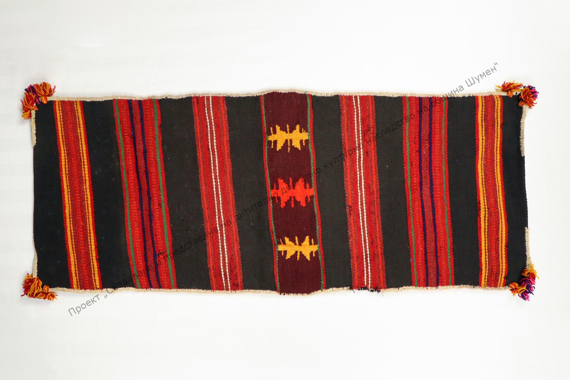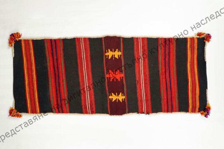 От вълна. Домашно тъкана на разноцветни ивици, в средата геометрични орнаменти. Украса от пискюли в краищата