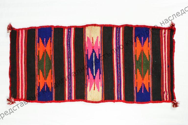 От вълна. Домашно тъкана диметно на разноцветни ивици, между тях късани фигури, с украса от пискюлчета в ъглите, 20-те години на XX век