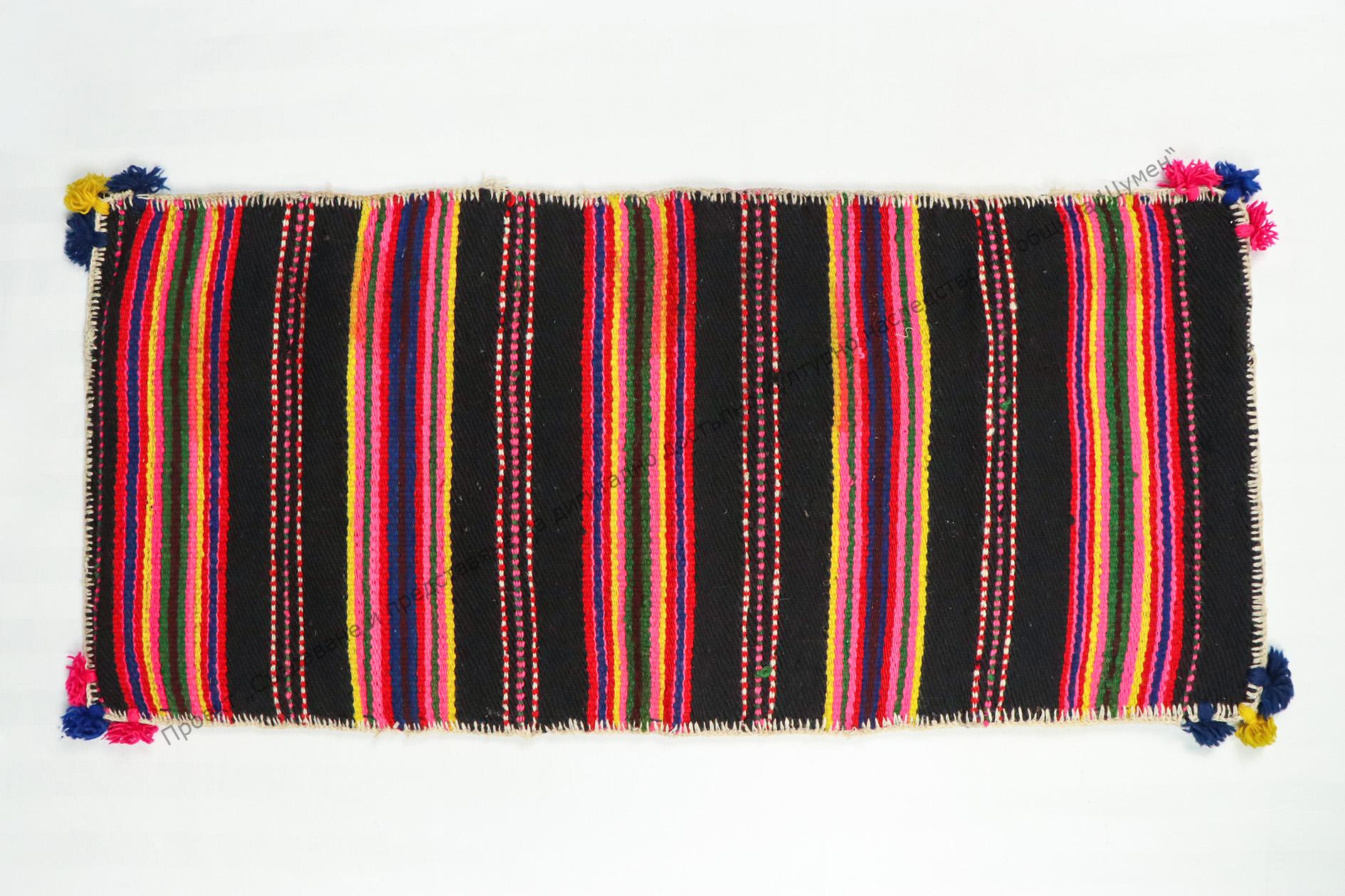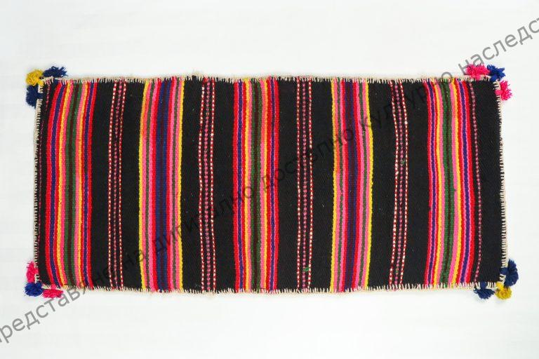От вълна. Домашно тъкана диметно на разноцветни ивици, с украса от пискюлчета в ъглите, 30-те години на XX век