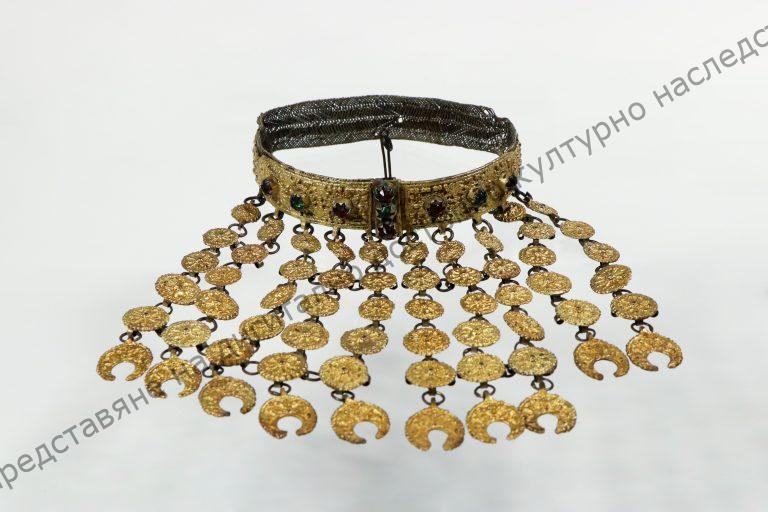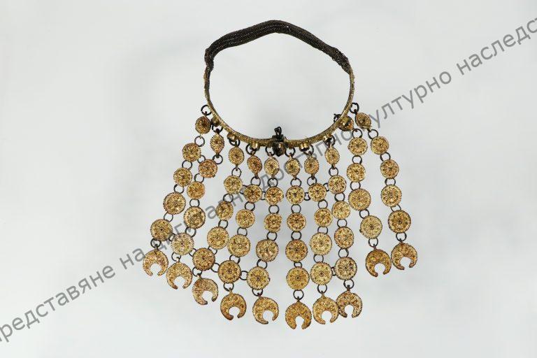 Тип „кованез“. Състои се от две бронзови дъги, съединяващи се с шарнир, с гранулирана украса и камъчета. От дъгите, посредством халки са закачени гранулирани бронзови кръгли плочки