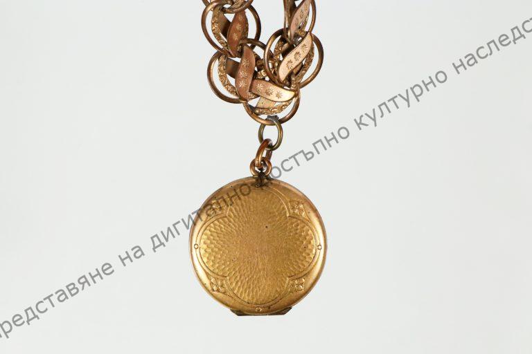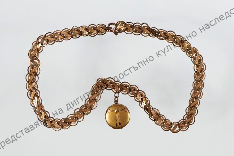 Кордон с медальон. Кордонът е от метална сплав със златно жълт цвят, форма на листовидна пластинка, гравирана. Медальонът кръгъл, с украса от камъчета от едната страна и от другата врязана украса като килийки. Подарен за годеж, началото на XX век